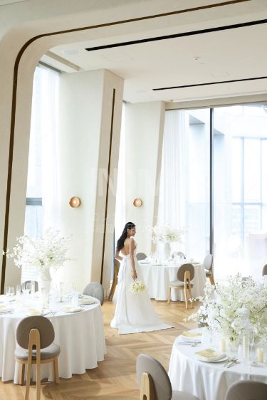 力強い建築の存在感を持ちながら、光が透ける繊細で透明感のある構成美。自然光の移り変わりにより浮かび上がる彫刻的な空間は、空間自体がアートになる、洗練されたモダンなバンケットホール。