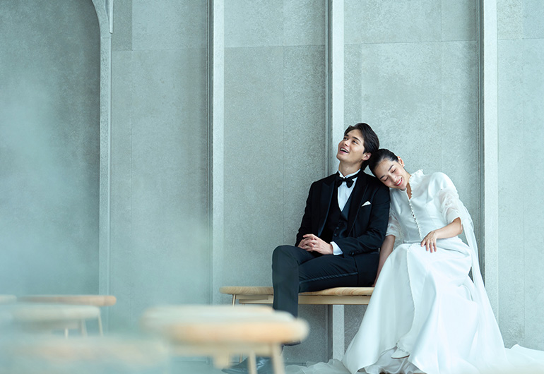 差し込む柔らかな自然光が新郎新婦を包み込み、